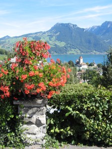 But, back to the first morning we woke up in Europe. I woke up early to the sounds of a piazza three stories down. I sat in a chair wrapped in the down blanket that came with my bed for about an hour before jumping back in bed to sleep more. Waking up to find we had overslept wasn’t a problem. Jumping the train at 11am and arriving to our chalet front porch by two wasn’t bad. On our way there, our first stop to see the Alps first-hand was in Thurn. Thurnsee, it’s liquid gem color set a beautiful table to the mountains, fresh red flowers, a chapel steeple, farming terraces and the iconic swiss chalet (with stained wooden horizontal siding, and low over hanging eaves on thin A-frame houses.)