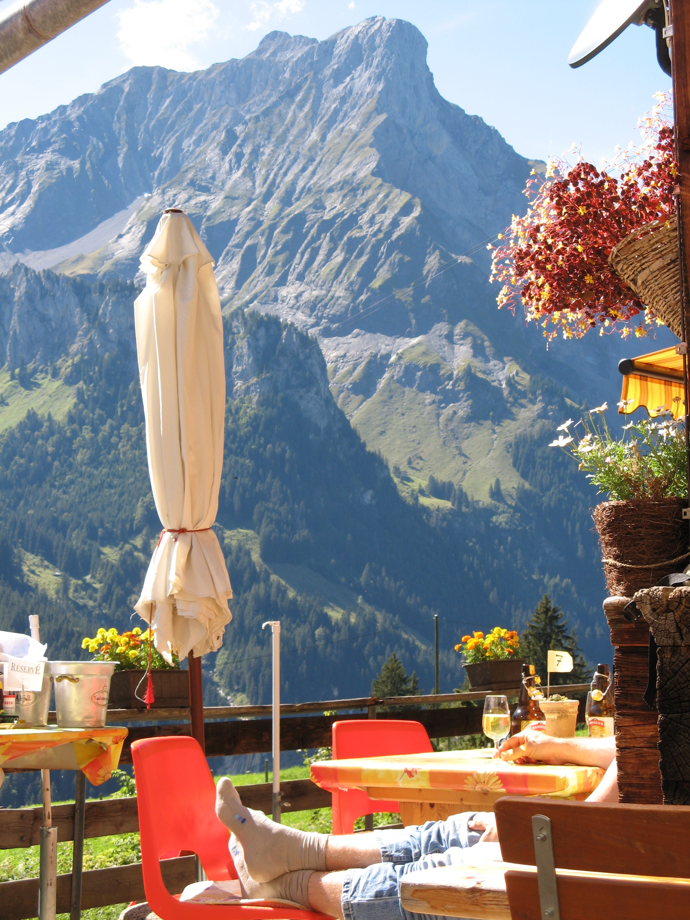 The Suisse positive flag is perched on the slate roof. We left the doll house facades and ceramic tile roofs in Zurich. People are older here, having tall plates of ice cream and cream whipped. Streams in the places where mountains touch glisten and the east faces cast dark cloud shadows. But I am drawing in the sun.