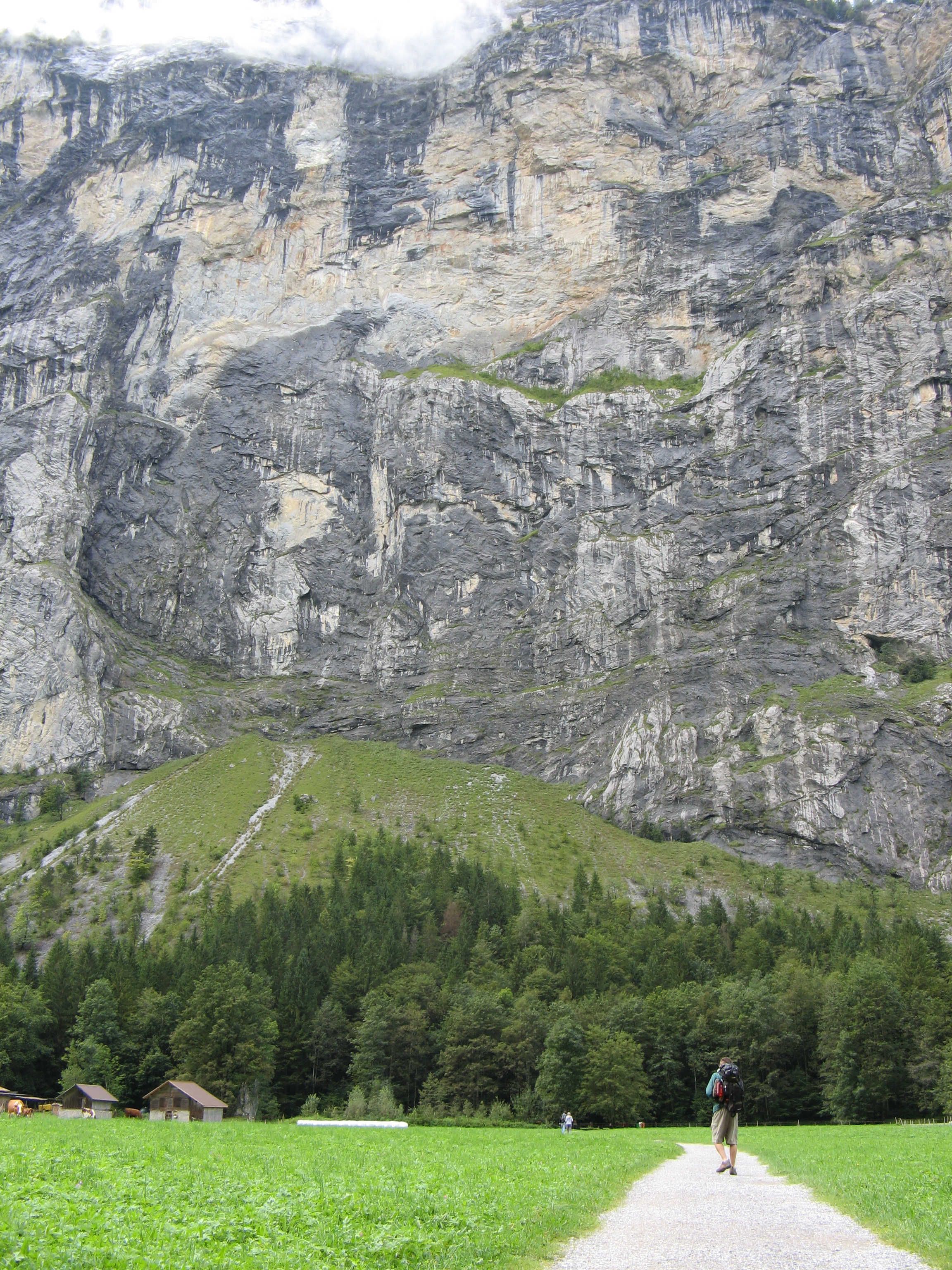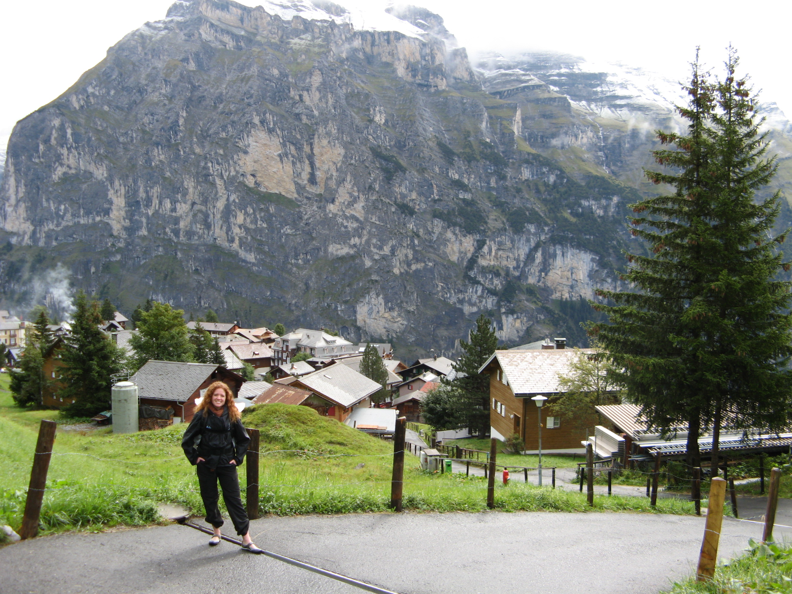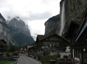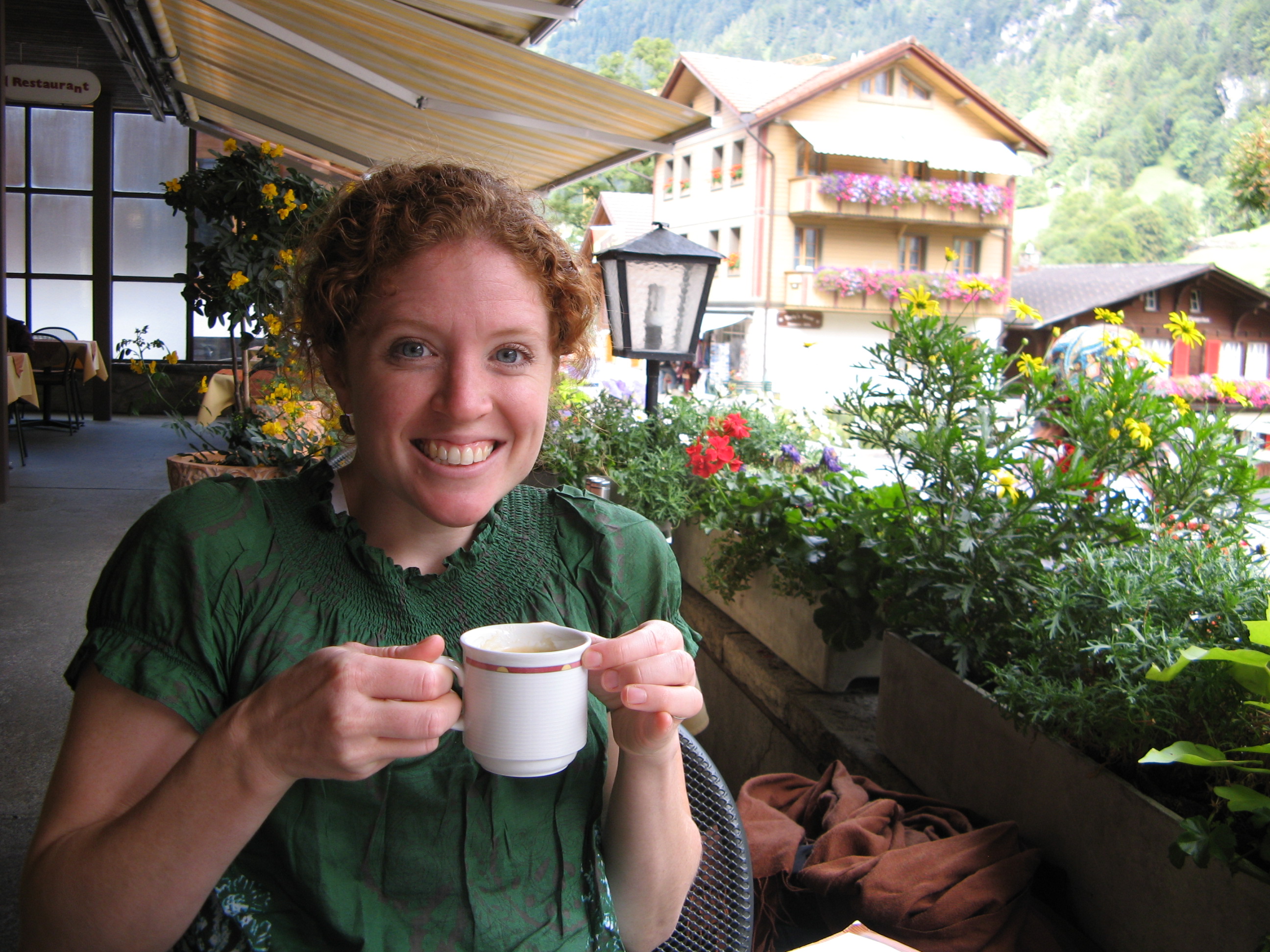 We walked into Lauderbruden from the falls and wanted to find somewhere to have warm soup. The grass was so green, I felt alive and free and open, even in the gorge, as if it made me feel that way with it’s shape. Waterfalls looked like they were falling on houses, and no one here even gave them a second glance. We sat on the front porch of a restaurant and had soup and coffee. Phil’s shoulders hurt, but I was doing ok with most of my backsack weight around my waist. We admired the green roofs and pristine graveyards of the town. There were places to camp before we came into town. It was here that I realized the direct effects of coffee. It made me happy. No wonder I loved Italy so much. At the top of every peak, around every corner, just outside every church, there was coffee… but that finding was yet to come.