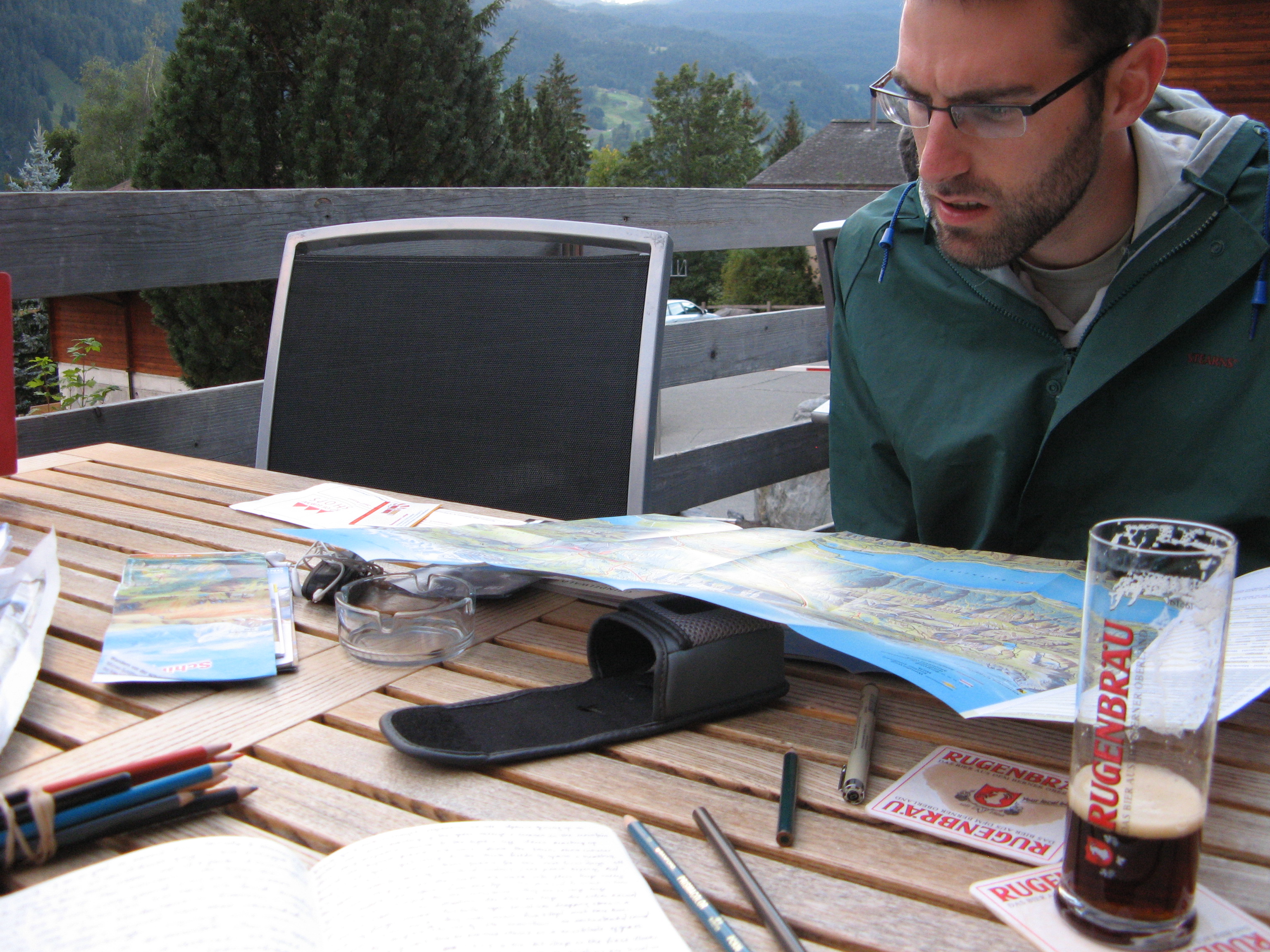 We found Cafe Bar C & M nearby. Wanting to take in the beautiful surroundings on the deck outside, catching a mountain sun setting, was made warmer by the fleece blankets provided by the staff as we decided to order beers, write and read. Phil began studying the map, which became a favorite dinner pass time for us on our entire trip.