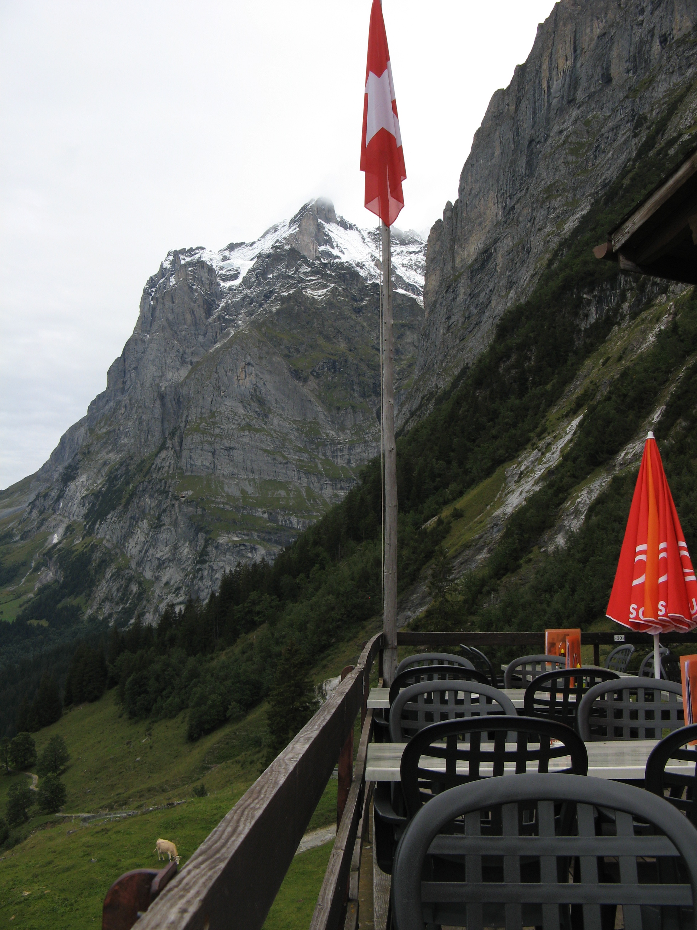 From the lunch deck where we had soup and beer I looked out over the town. Grindelwald is it’s own stream collecting to form a strong spine of a chalet ridden city. This town is for rock climbers. Eiger’s face is the sheerest vertical face in the world.