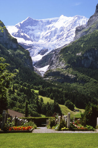 When looking at a map, Grindelwald does not look large, but from town, the mountain sides creep up in the North and South direction, creating an East to West crease along which the main street spans over a long distance. There are many streets perpendicular from the main street which creep up into North and Southern mountains.