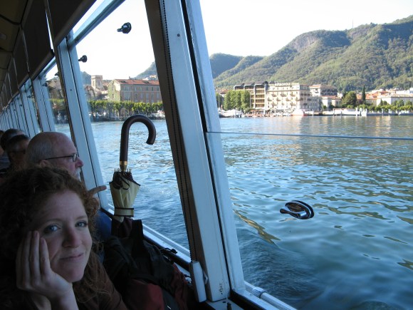 There are two main thoroughfares to Bellagio –one by the lake and the second up many stairs. Most of the peninsula was private for the residents’ gardens of rosemary, kiwi and figs. We sat beneath a metal canopy –Carlsberg, and had coffee laced with Amaretto to watch children run around recklessly. We ran up and down the streets steps, finding a new shop at nearly every stair. Some two-table cafes or wine shops had tables straddling the stairs by way of a home-made platform. Phil bought a cap in one of the shops. We roamed for a while, glad to be warm, alone and without a plan. I found a skirt I liked and wanted to mimic some day. I took a picture while we were waiting to board the boat back to Menaggio and embarrassed Phil when the flash went off.