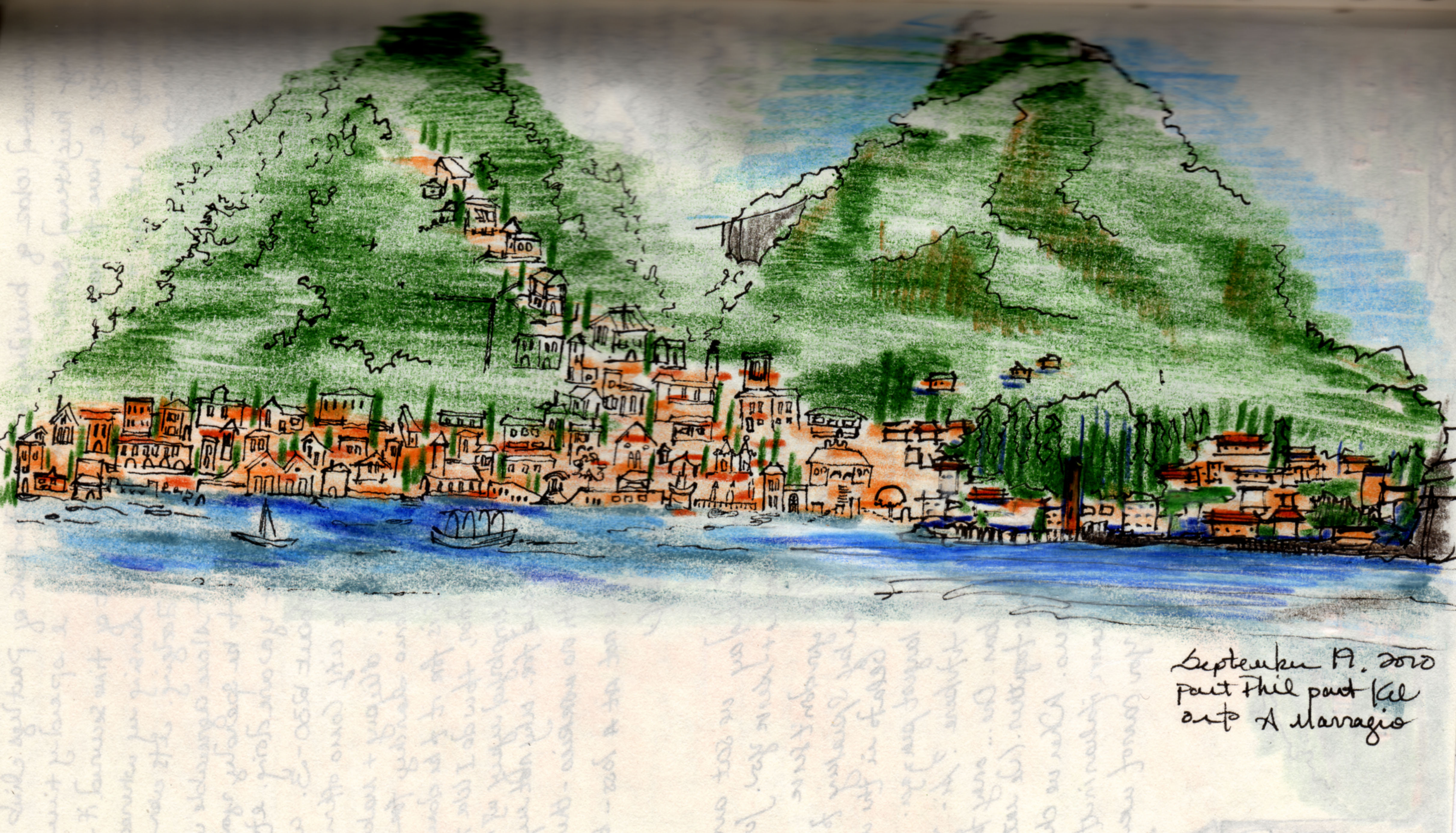 So we rode the water, it was a cool fall day outside. Phil meandered from our booth to the outside deck and back while I drew trying to understand shade, detail and overall scene. Phil and I drew together. Near the end of our trip north we watched people run off at Cavatca. Lots of people got off the boat at Bellagio. Fashion so far had been a flashback of the American 80’s –hightop pink sneakers, stir-up pants with heels… seriously?