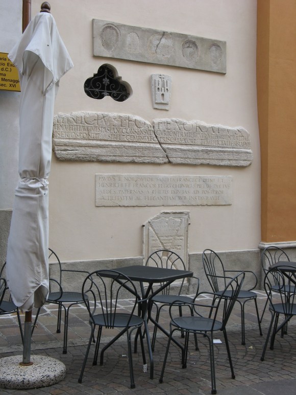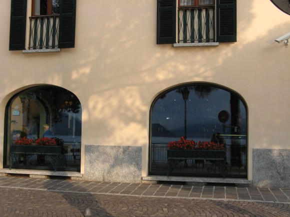 We climbed today, to a church in the clouds. We woke up early and had breakfast listening to the church bells ring. We walked around an empty piazza, before most people were awake. there are some people having breakfast behind the window of a glassed-in archway.