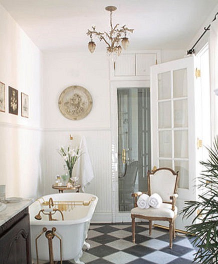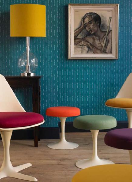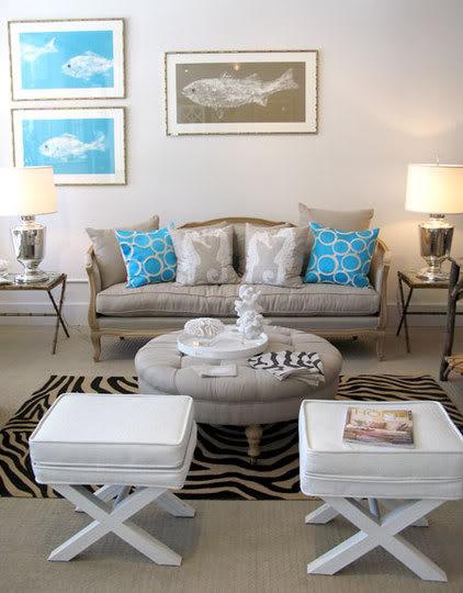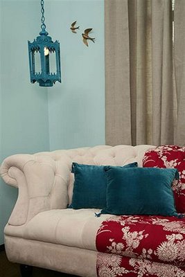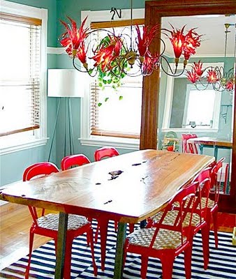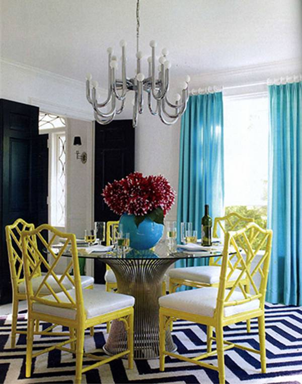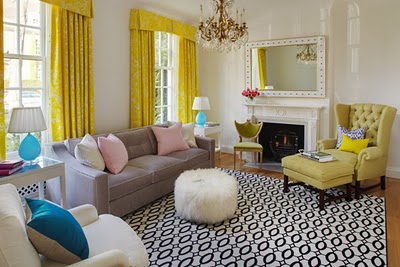 The rooms above show a saturation of color as compared to this one that uses the same colors to accent a white palette. Notice that in the images of color saturation the eye often rests on rigid, structured patterns. See the parquet rug, the checkered wall and the zig zag carpet?