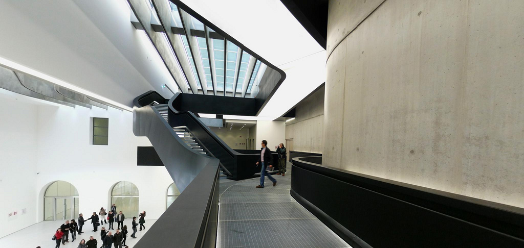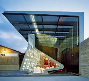 Zaha Hadid and her wine bottle section for a shop and tasting room at the Lopez de Heredia Winery in Spain.