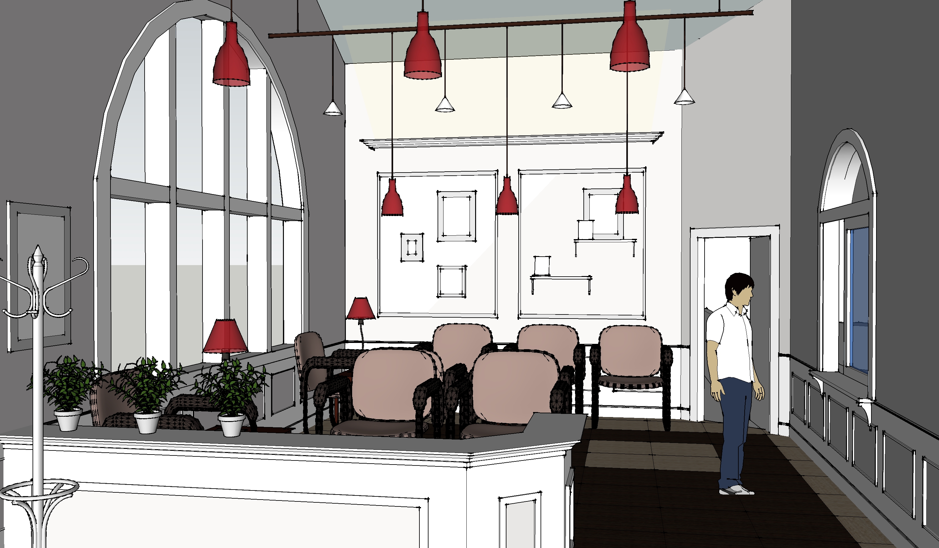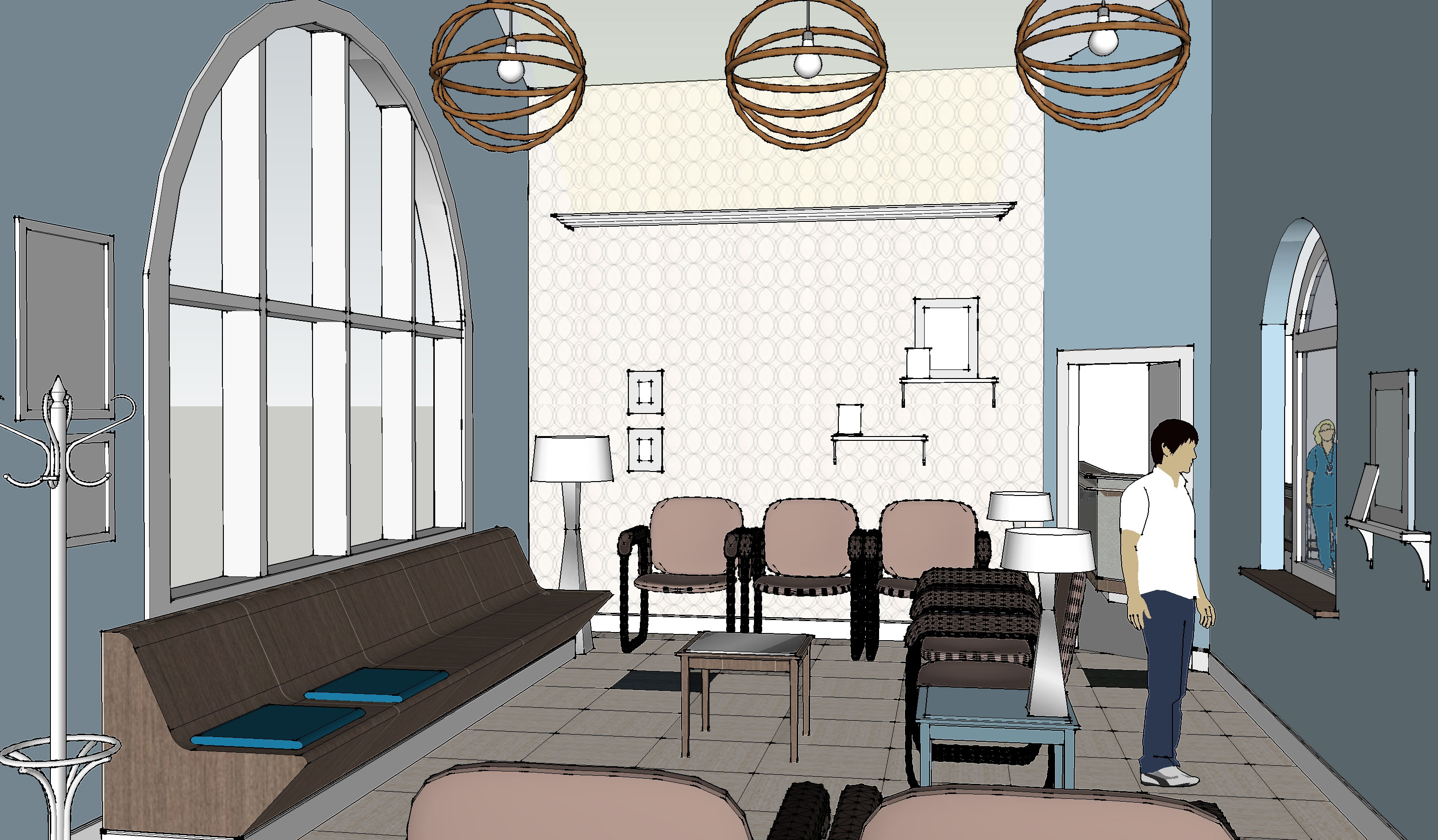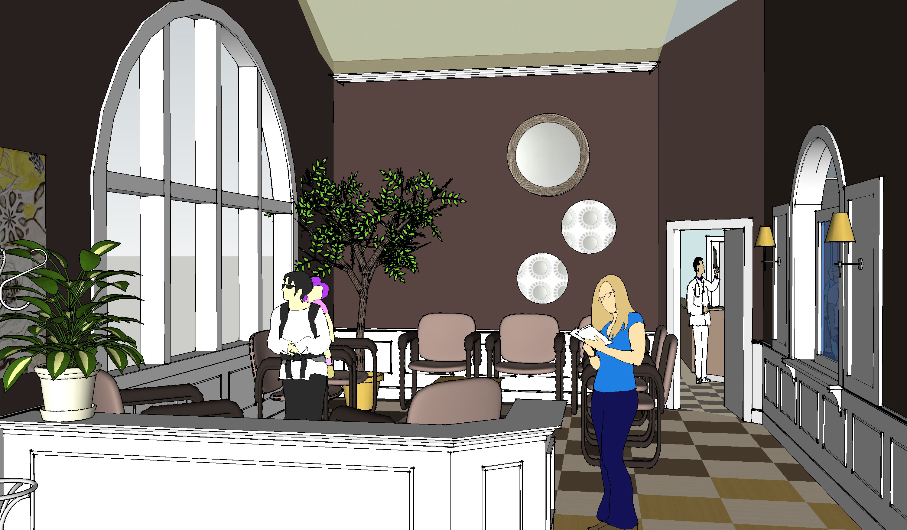 This blog is dedicated to the need for good interiors. I want to make a case for where we spend our time and how the aesthetic of places influences the vibe. There is a relation between happiness and color. Sprucing up where you sleep, eat, live, and work makes a positive impression on what you expect from yourself while being in certain places. The interior needs a balance of materials using color and texture. For example, the doctor’s office scheme below defines one interior using a background color and an accent, I arranged a carpet to look like it had a center mat. The mat is a contrasting color to the edge pieces. This use of carpet in two colors defines a room with a pattern of color, creates direction, and therefore interest. See more experiments with color, texture and arrangement below.