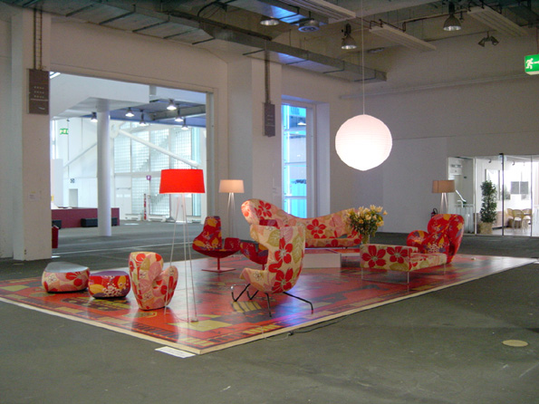 (In a concrete room a bright-colored rug makes the space)