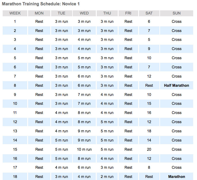 Though my first marathon won’t be until this October I am going to prepare this spring by running up to the 18 mile marker. My brother suggested the schedule below: Hal Higdon Training Program: Novice 1 for beginner marathoners . I’ve begun to follow the regimine but was glad that the first week I could actually run 6 miles on a Saturday. For the real race I plan to begin training a few weeks ahead of this schedule.