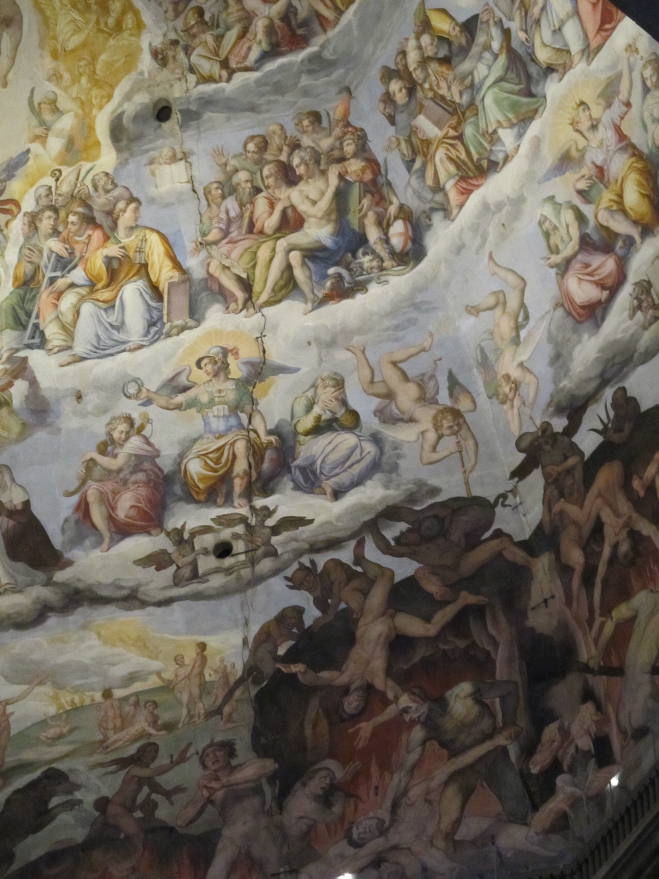 April 28th, Monday. Florence is lush, crowns and crosses. The first night there we walked to place the city. We touched and discussed the heavy doors outside the Duomo in piazza del Duomo and the bands of statues in the façade. Because it was five o’clock, there weren’t any lines to walk into the church. The Dome was one of the most beautiful we would see. Painstakingly painted from Heaven to hell. The colorful marble floors, side altar statues and tapestries, all of it leading up to this magnificent dome painted by Viccoli, Giorgio Vasari, or Frederico Zuccari.