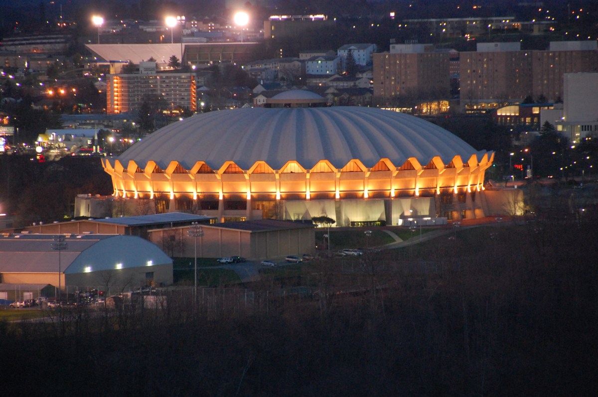 The above photo is by Rich McGervy via Flicker. The keyhole view of the WVU Coliseum below is by Waller Corporation on the first floor of Marriott’s hotel under construction. The new Courtyard will have spectacular views of the Monongahela River and the city of Morgantown, WV.