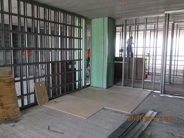 What you see in the picture above is the bathroom shaft without shaft walls. Plumbing and HVAC equipment fits within this L-shaped opening. The oddly shaped opening had to be coordinated with all of the design trades, the concrete floor fabricators, and of course, the bathroom POD. It’s been quite an effort and seeing the built product of what has been on a computer screen for so long has been the most rewarding of the entire process of creating this hotel.