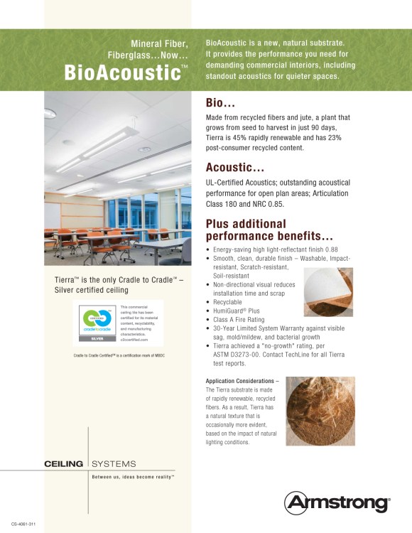 Armstrong’s bio acoustical panel made from jute is a great T grid system option.