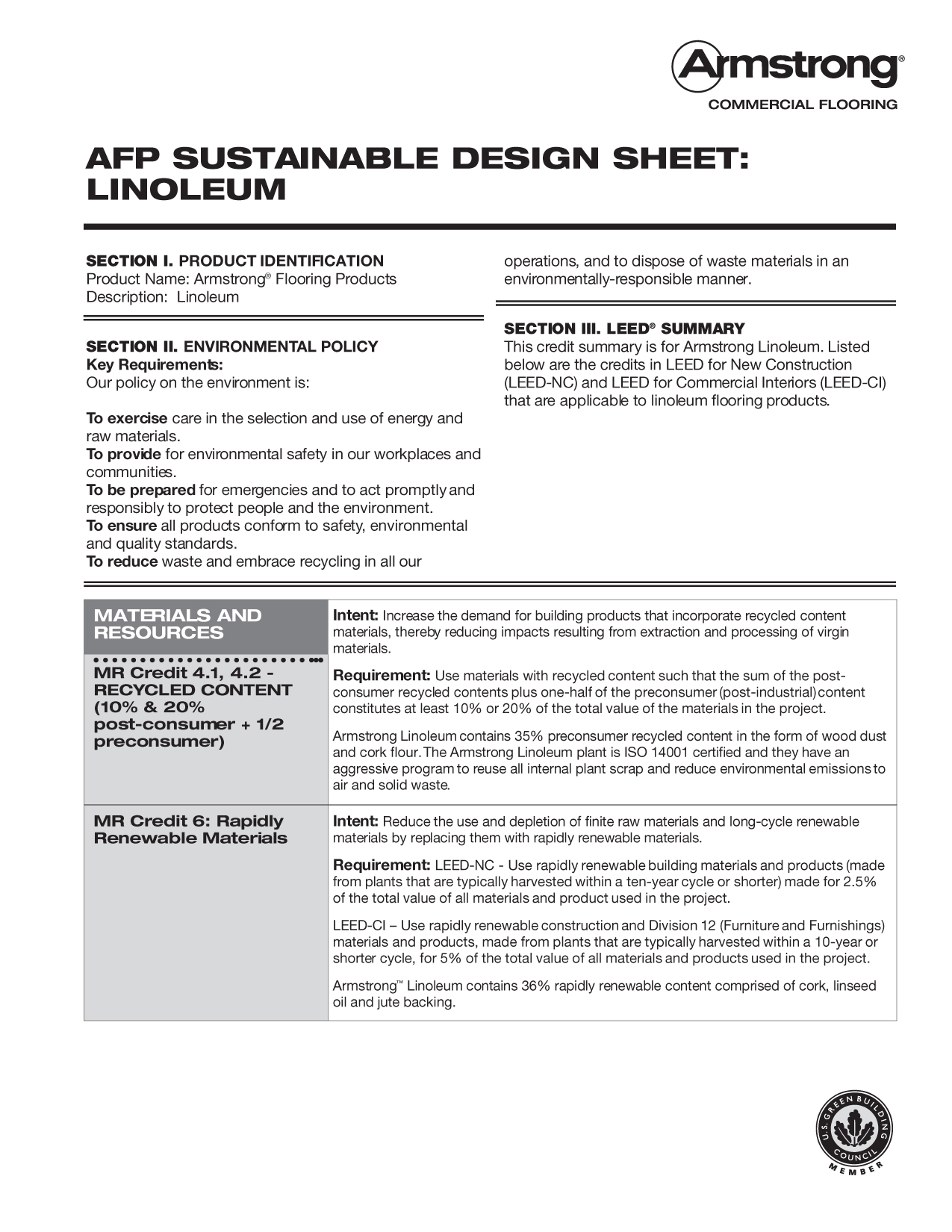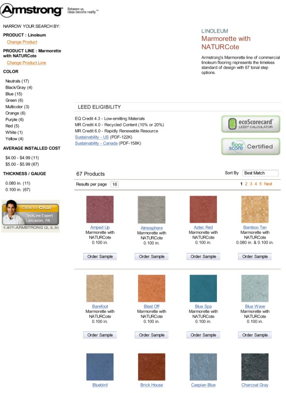 Linoleum is a more sustainable product and manufacturing companies include Torlys, Armstrong and Forbo. Colors between manufacturers are similar. The 12 inch x 12 inch VCT tile can be made with recycled content. The Armstrong product is an option.