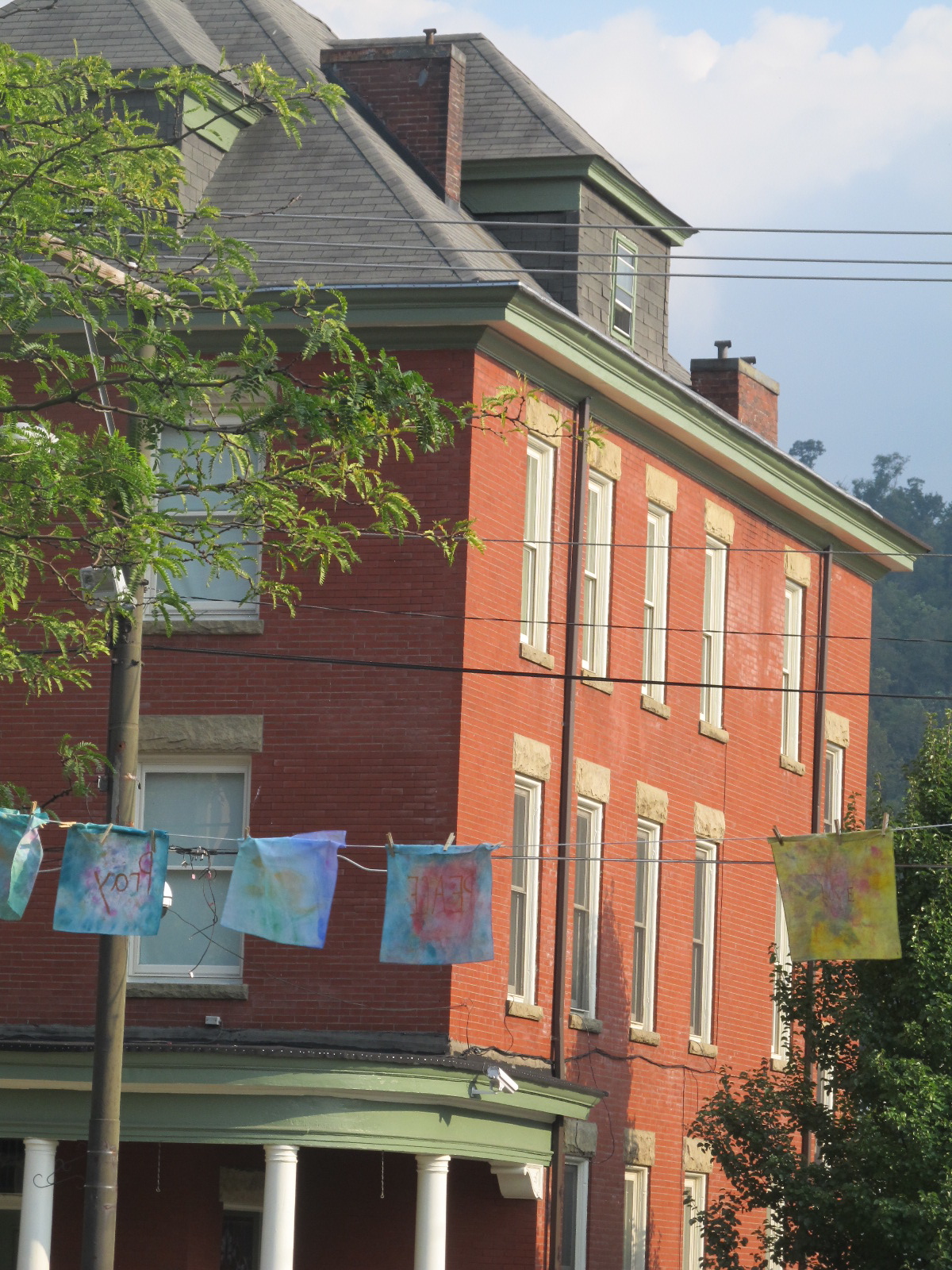 The East Wheeling Wednesday Farmers Market is trying to get ‘The Word out On The Street!’ Word on the street was the theme a few months ago. This week, below, colorful banners flew across the road signaling passersby to stop. The event challenged attendees to ‘Bitter Sweet Tie Dye’ their clothes. The corner is a creative force in the neighborhood that brings children and adults together.